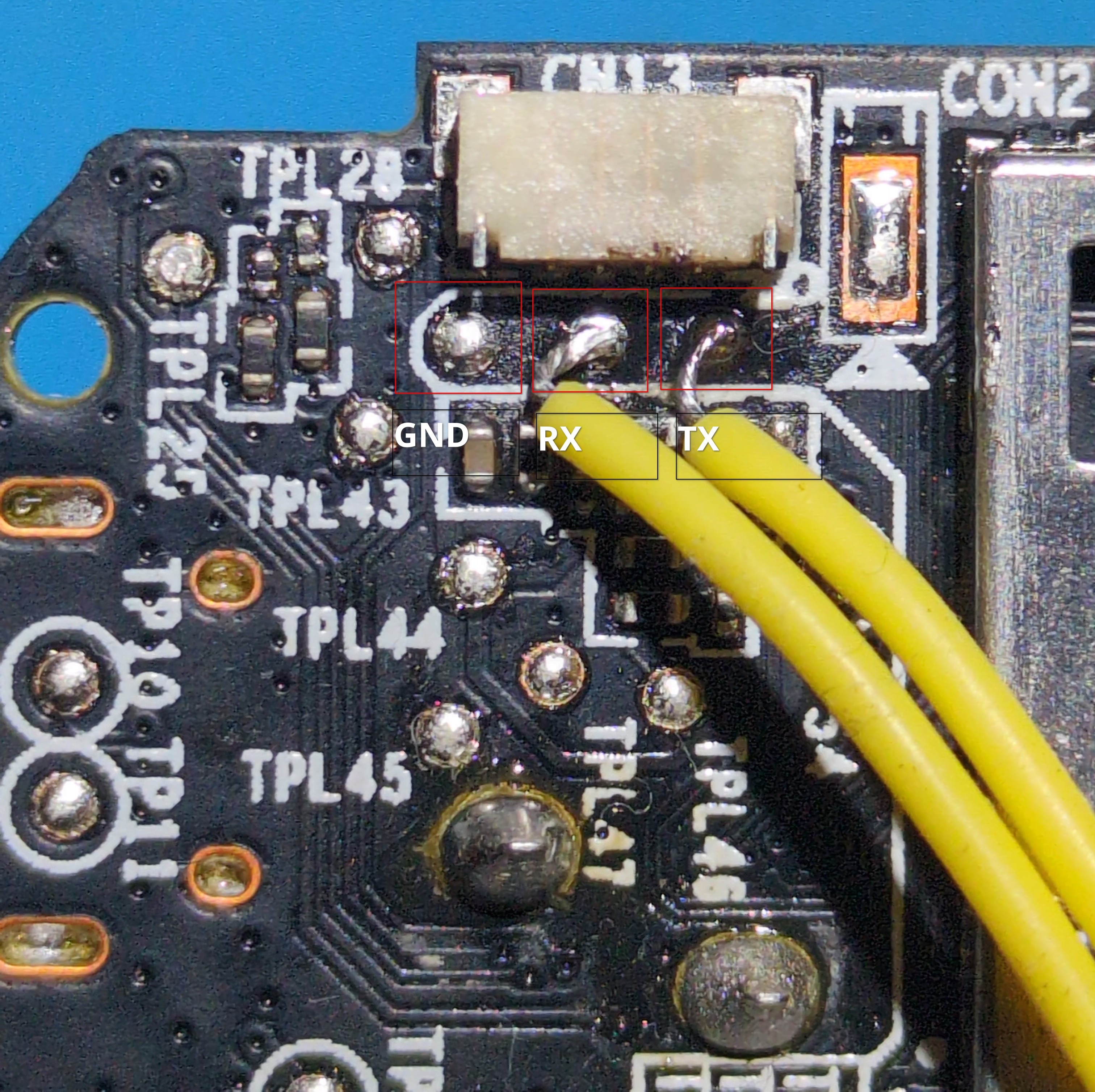 Three pads in particular looked like UART. Using a multimeter I probed the pins during the boot sequence and confirmed that my suppositions were likely correct. One pin was ground, another a constant 3.3v (RX or receive) and the last fluctuated (TX or transmit).